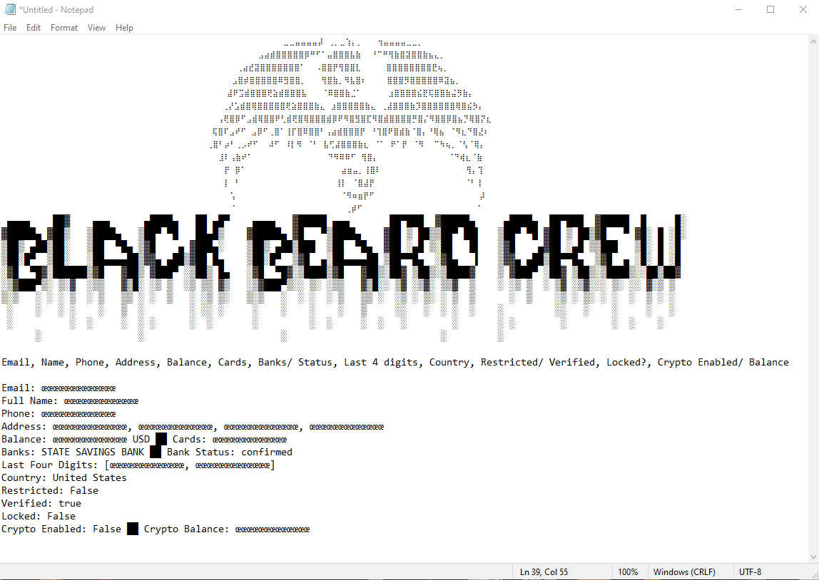 Email, Name, Phone, Address, Balance, Cards, Banks/ Status, Last 4 digits, Country, Restricted/ Verified, Locked?, Crypto Enabled/ Balance