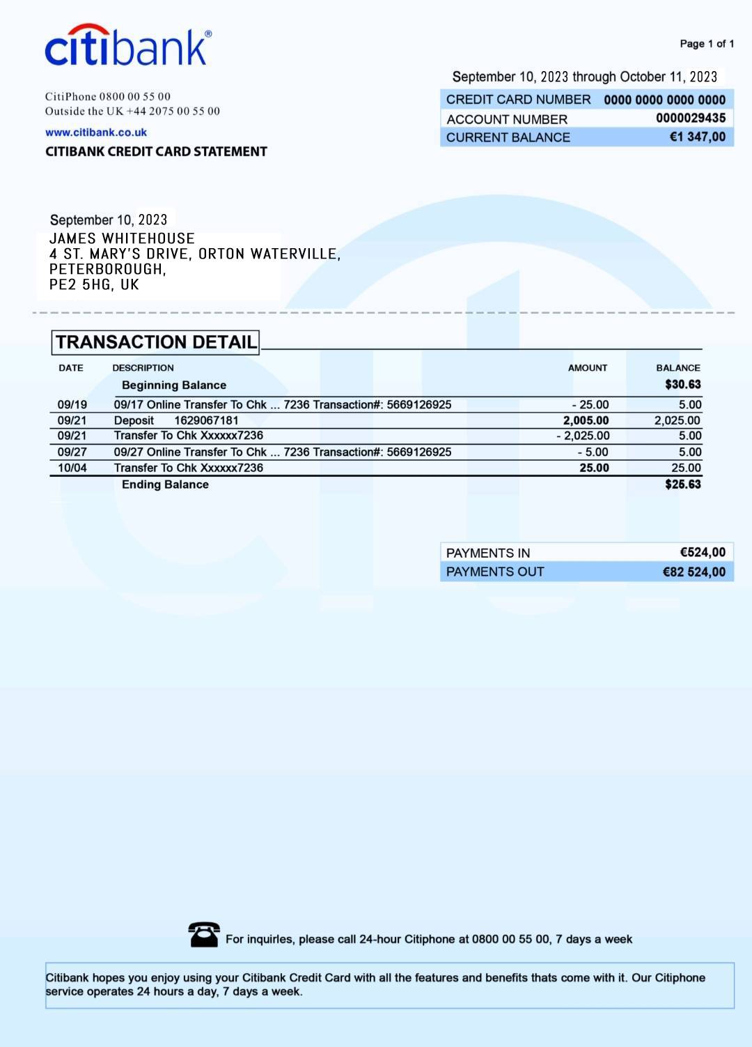 Citibank statement UK