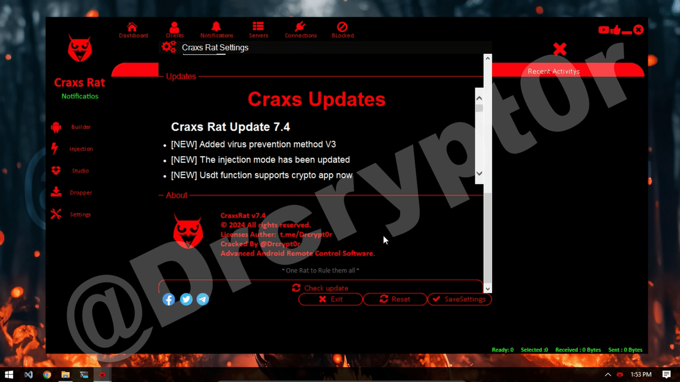 Added virus prevention method V3 The injection mode has been updated Usdt function supports crypto app now Craxs Rat can send commands to show or hide icon Can now quickly input payment passwords for imtoken and tokenpocket Now the processing speed of anti-uninstall is increased The usdt function is compatible with the latest version of binance Fixed an issue where some vivo phones would not display in the craxs client Adapted to the latest version of Alipay and wechat payment password records