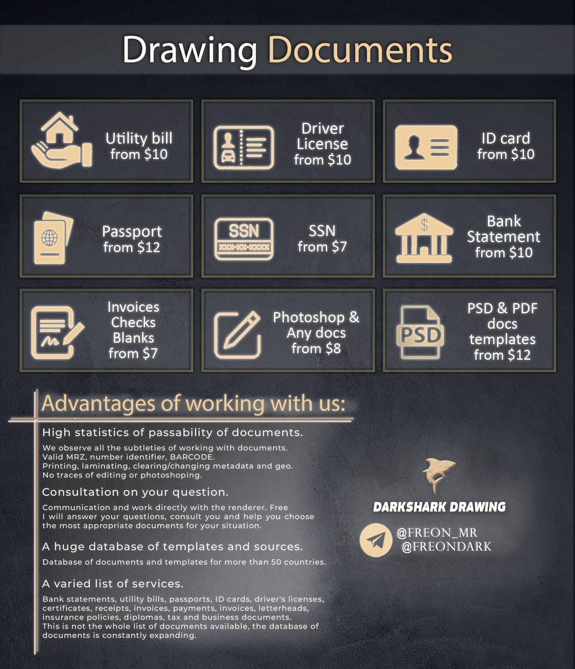 ID Card, Driver License, Passport, Bank Statement, Utility Bill, SSN, CC, Checks, receipts, invoices, Forms, Blanks, Any docs, payroll, paystub, birth/death certificates & other.
