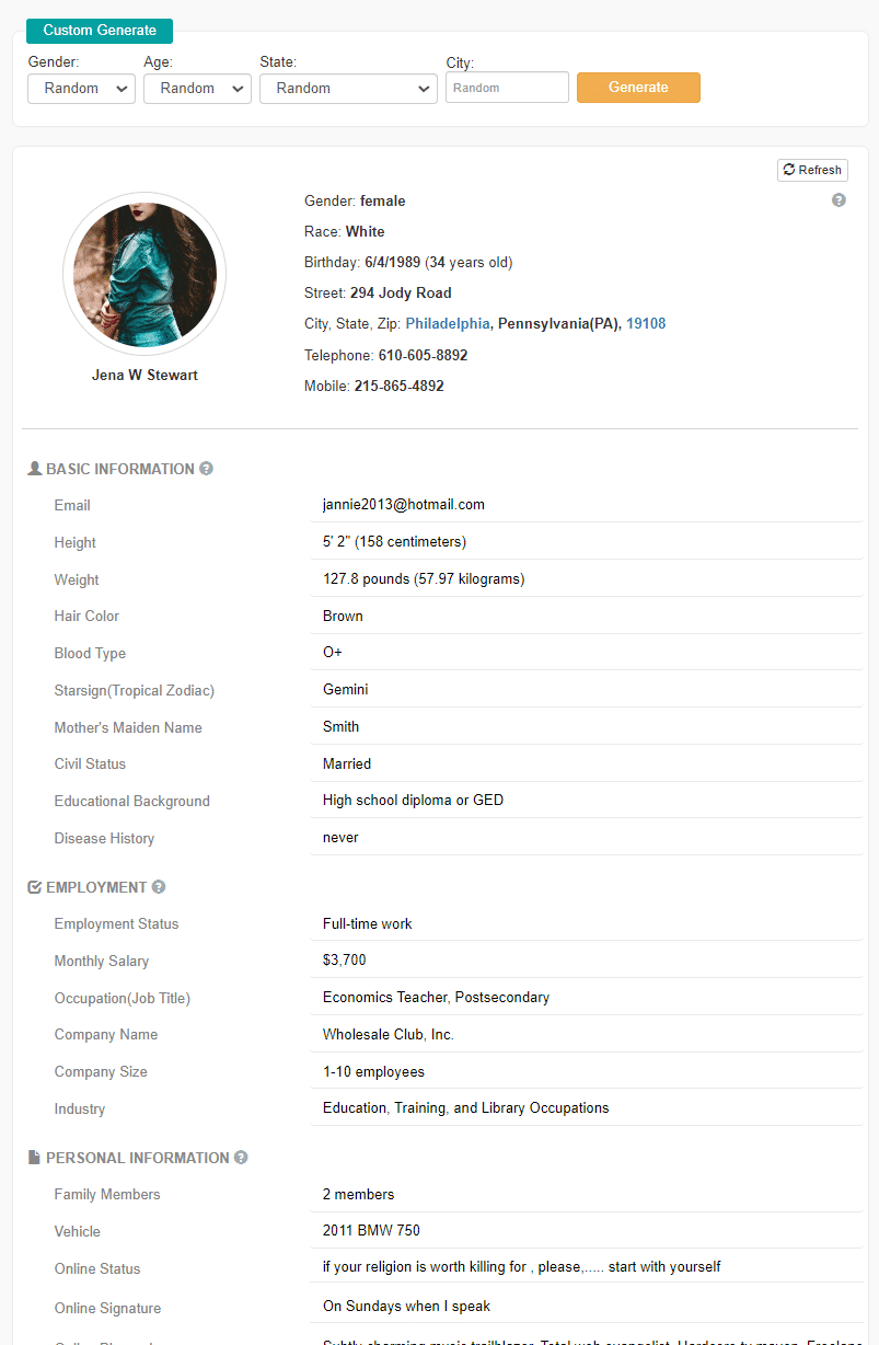 Generate random person(identity) from US, include name,address,phone,email,employment,family,personal information like interest, online profile, brower, and more. Use for testing as database.