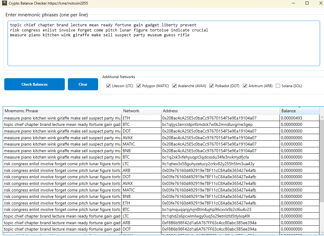 Fast and reliable tool for checking crypto balances across multiple networks. Supports BTC, ETH, BNB, LTC, SOL, MATIC, AVAX, DOT, and ARB.