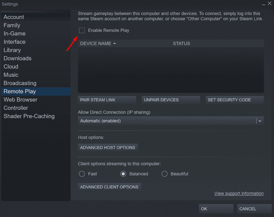 From the Steam client Settings window, navigate to the Remote play tab. Disable "Enable Remote play…" using the toggle next to.