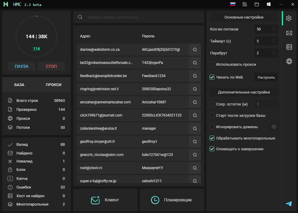 HACKUS MAIL CHECKER 2.3 is a specialized program for mass checking of mailboxes for messages, availability and other parameters. It can be used to monitor emails, search for attachments and other tasks related to email accounts. The program supports various protocols for accessing mail (IMAP, POP3), as well as proxy servers to ensure anonymity.