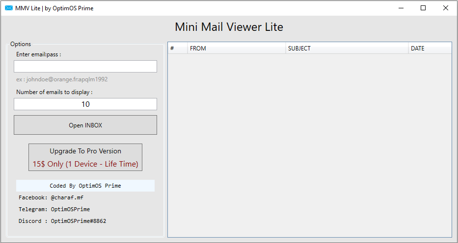 **Mini Mail Viewer Lite (MMV Lite)** provides streamlined access to email inbox previews through basic login credentials. Designed for rapid email content extraction, the tool supports loading email:password combos and displays up to 10 messages at a time, including sender, subject line, and date. Aimed at users seeking simplified mailbox visibility, MMV Lite is distributed freely with a premium version offering lifetime device access for a one-time fee. Social handles for the developer, OptimOS Prime, are integrated into the interface—highlighting the tool’s underground circulation across Facebook, Telegram, and Discord communities.