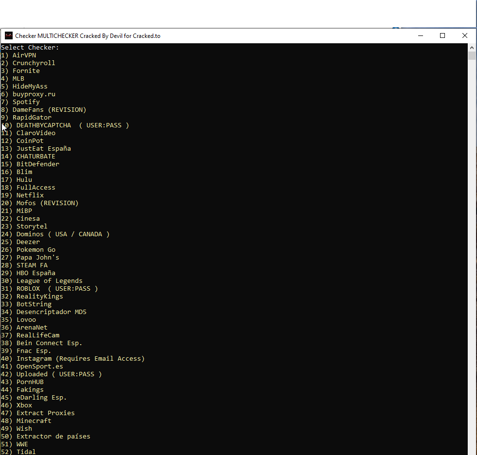 MultiChecker 1.05 by Devil reads like a black-box operations hub: a compact, terminal-first utility listing scores of service modules (streaming, gaming, VPNs, marketplaces, and more) so an operator can pick a target and run a quick sweep. The program’s strength is sheer breadth — dozens of named checkers live in the same interface, from Netflix and Spotify to Fortnite, Steam, and Discord — presented as a single, scrollable menu that feels like a multi-tool for rapid triage. Performance is intentionally simple: low-overhead console I/O, immediate status feedback, and a workflow built around quick selection rather than deep configuration. For a reviewer, MultiChecker’s appeal is its convenience and coverage — it’s designed to let you compare outputs across many modules from one place, export results, and iterate fast — all while maintaining a stripped-down, operator-centric aesthetic.