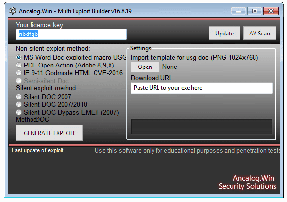 The exploit builder generates malicious documents, such as Word and PDF documents, Excel workbooks, CHM - compiled help files, and HTML pages. Most of them serve as downloaders, with the final payload stored at a website which is then downloaded and executed by the malicious code. In a few cases the generated document stores the entire payload file within. As a result, there is no need to reach out to an external web location as the malicious content is extracted from the document and executed from there.