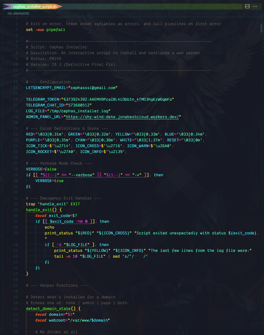 The resulting cephas_installer_script.sh should be ~1.7K lines and contain the complete interactive installer logic (colors, OS checks, LAMP setup, vhost + SSL, Telegram reporting, remote ZIP download/extract, etc.).