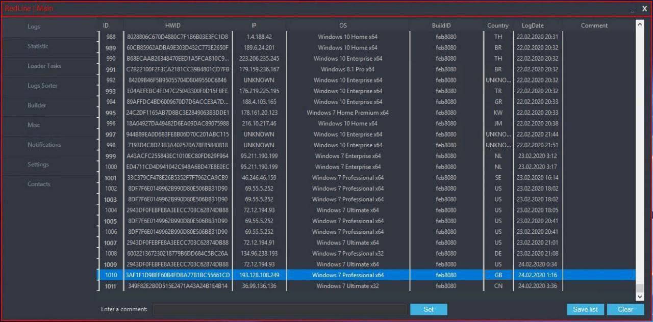 1) Display a list of logs with the following fields: ID, HWID, IP, OS, BuildID, Country, LogDate, Comment