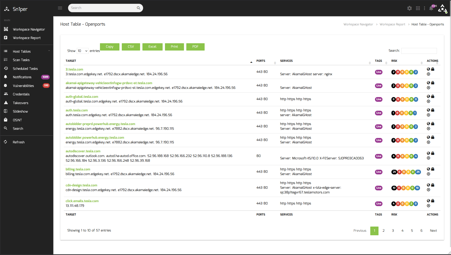 Export your entire attack surface inventory (ie. sub-domains, DNS, open ports, HTTP headers, risk score, etc.) to CSV, XLS or PDF format.