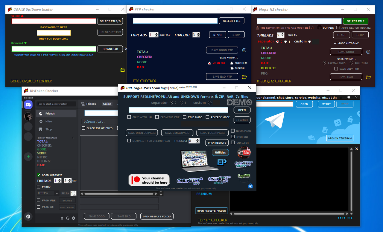 Access to the network is needed only for utilities that require it (FTP, MegaNZ, Gofile Up\Downloader, Discord and TDATA checkers).