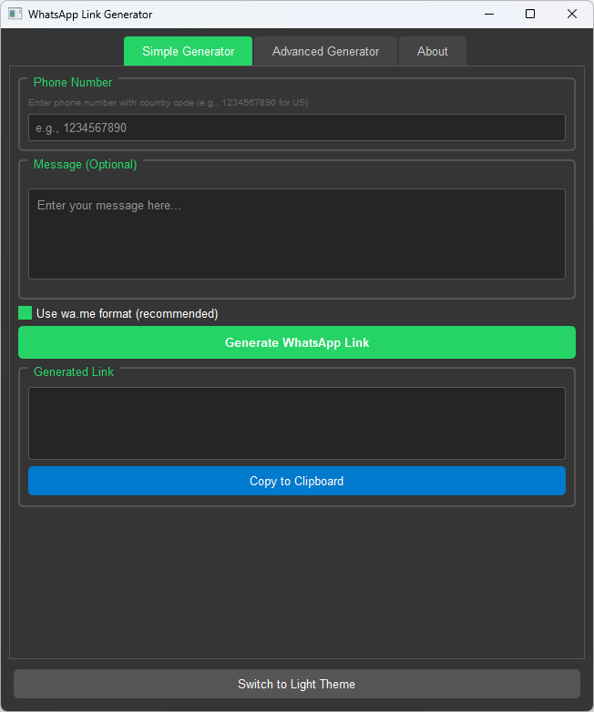 The WhatsApp Link Generator is a professional desktop application built with Python and PyQt5 that allows users to easily create customized WhatsApp links with pre-filled messages. This tool is perfect for businesses, marketers, customer service teams, and individuals who need to generate multiple WhatsApp links efficiently.The application features a modern, user-friendly interface with both dark and light theme support, making it comfortable for extended use. It runs completely locally on your computer, ensuring data privacy and security.